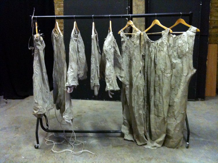 For the second run of 'A Broken Part' at Camden Fringe Theatre, Philip began to explore more conventional costume design through use of fabrics. He created a lace costume that contrasted the weighty costume of the first run. The lace was inspired by the story's protaganist obsession with his family home and its tables covered in lace. The ceramic crowns, the rose-encrusted beaded necklaces, and the giant crosses were also worn and were again created to be transitory objects.