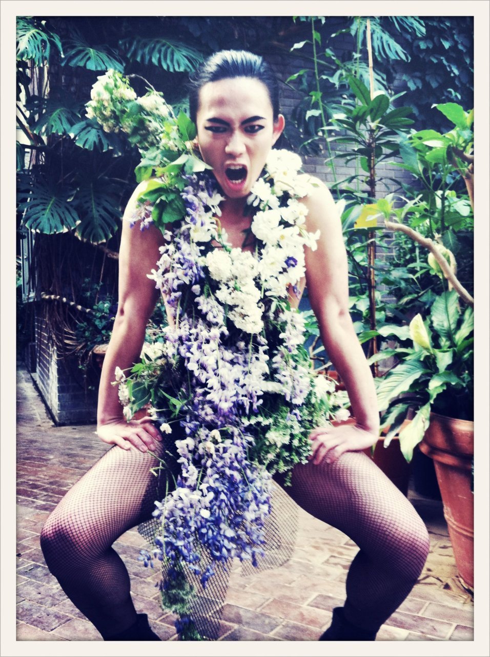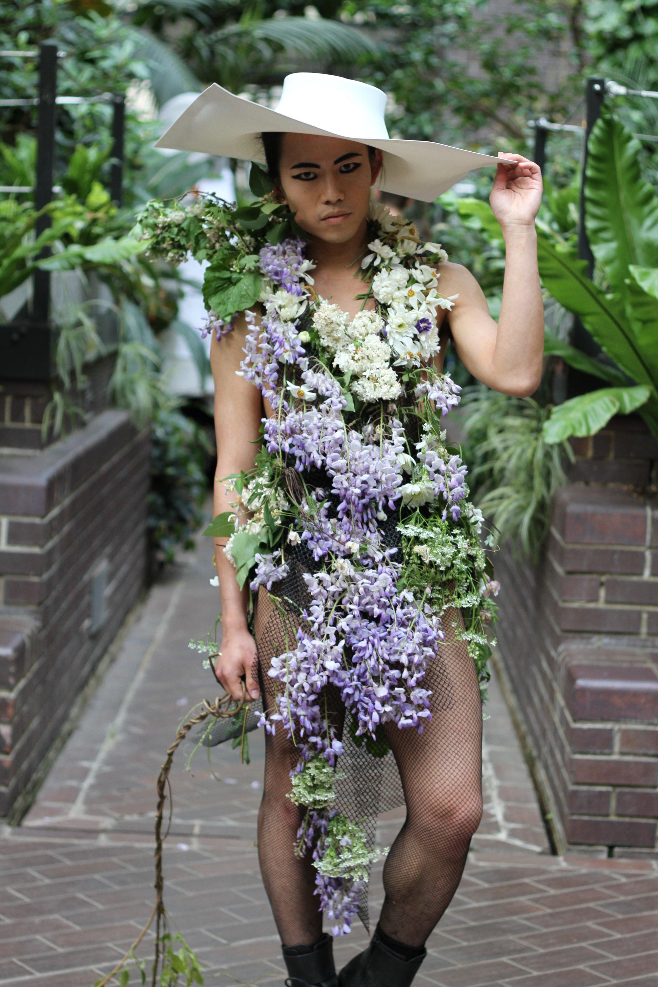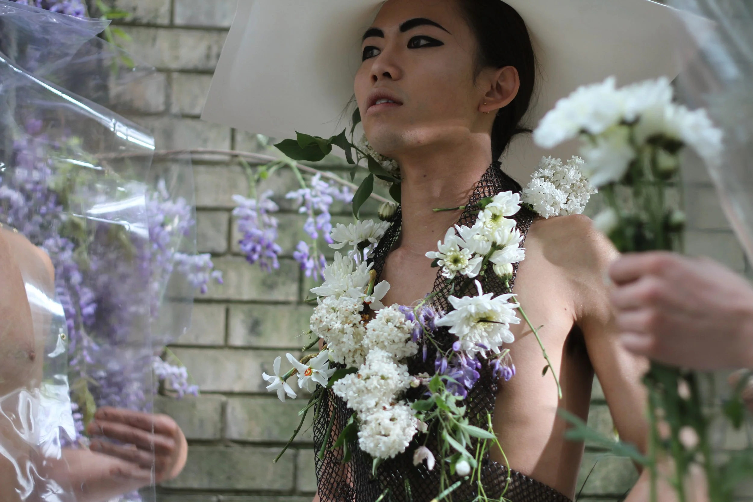 To create the flower outfit, Philip worked closely with Artist Gardener, from Area 10, an artist-led space in Peckham that was known for its challenging new approaches to art, hybrid art forms and collaborations. The flowers would blossom and wither within the day, referencing Alexander McQueen’s 2007 Sarabande collection depiction of beauty, decay and death.